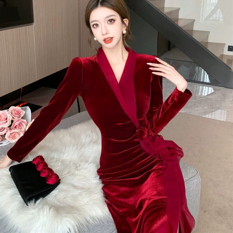 シックで美しい、ウエストを締める、甘くてスパイシーなスカート、エレガントな女性、高級な絶妙なベルベットのドレス、秋冬スタイルの女性 大人ガーリー スウィート キュート カジュアル オータム 秋物 ウィンター 冬物 yingd97899382378