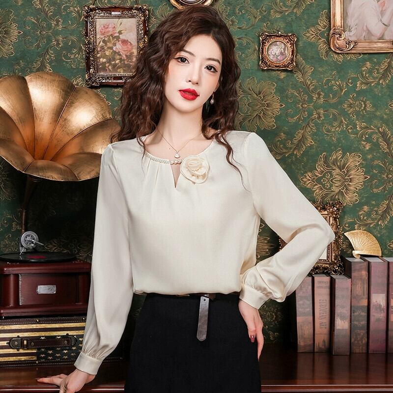 2024年初春の新しいスタイルのシックで美しいボトリングシャツ女性、ニッチで甘くて多用途な長袖シフォンシャツトップ ロング 大人ガーリー スウィート キュート カジュアル スプリング 春物 yingd32175696964
