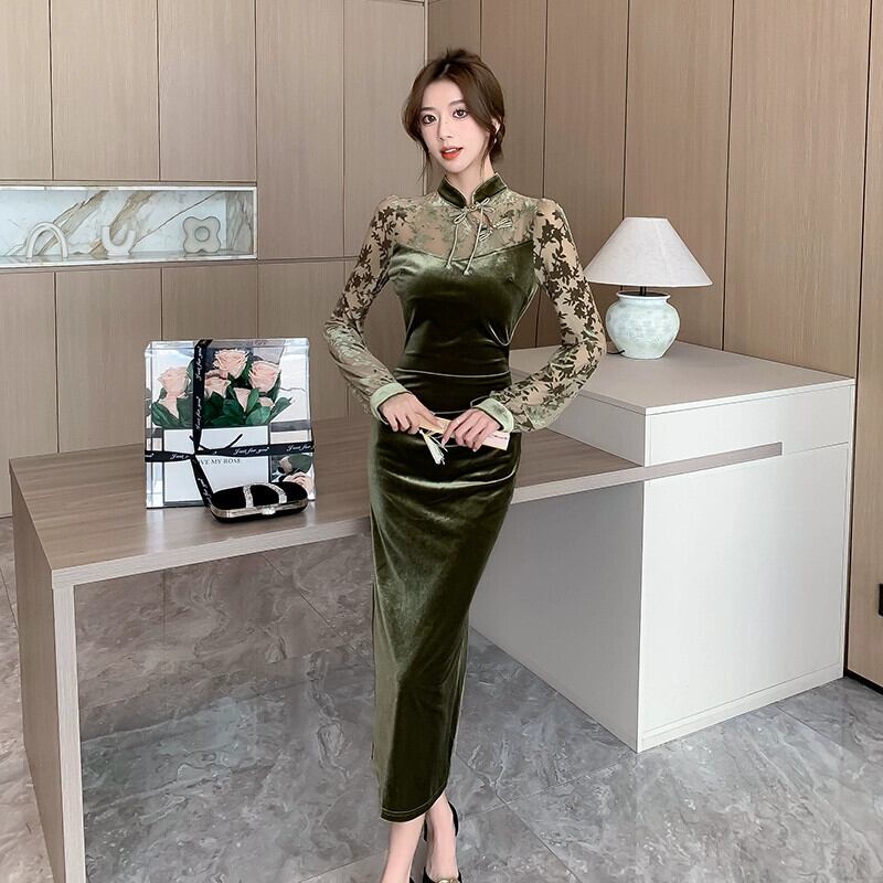 中国風の女性の秋と冬改良されたチャイナドレスヒップカバーロングスカートレースステッチベルベットハイエンド絶妙なドレスの女性 オータム 秋物 ウィンター 冬物 yingd34103995659