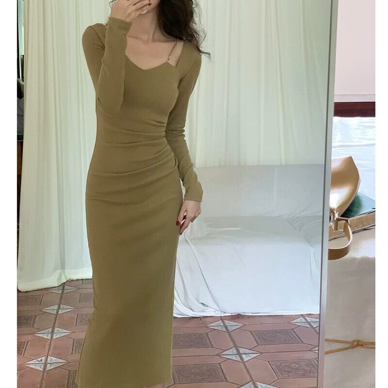 秋服、ハイエンドで超見栄えの良い、タイトフィットヒップハグロングスカート、長袖スクエアカラーチェーンドレス、2024年の新しいスタイルの女性 オータム 秋物 スクウェア yingd28431627929
