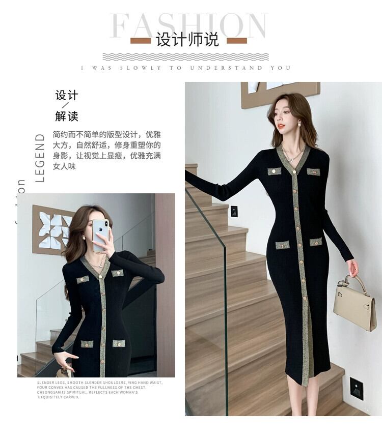 女性の秋冬のミドル丈のボトリングスカート、コートとセータースカート付き、スリムなヒップカバーVネック長袖ニットドレス ロング オータム 秋物 ウィンター 冬物 スリムヒップ yingd51507594953