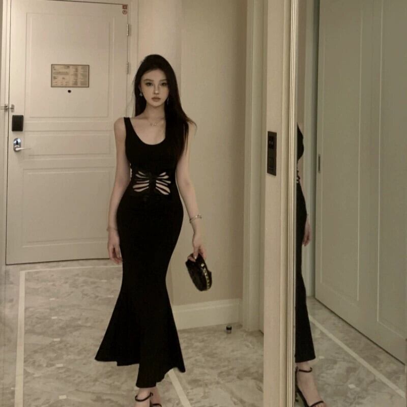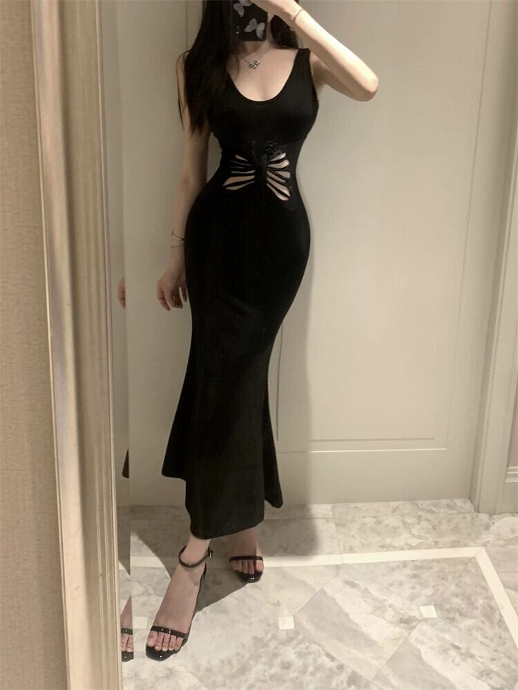 くり抜かれたおへそとスリムなウエストが純粋にセクシー、お尻をカバーするスリムフィットのフィッシュテールロングドレス、黒のサスペンダードレス ブラック yingd33238353106