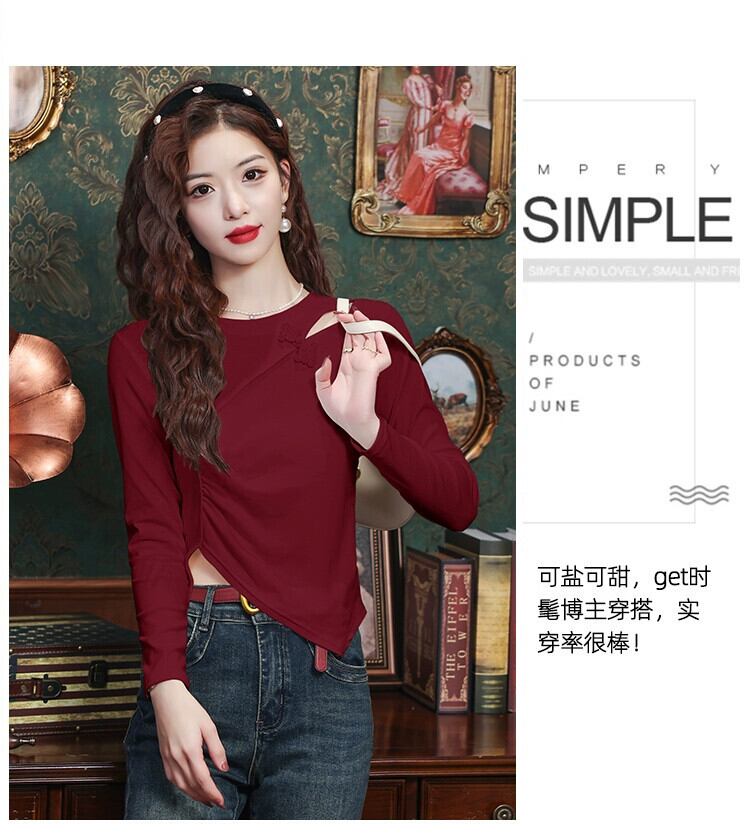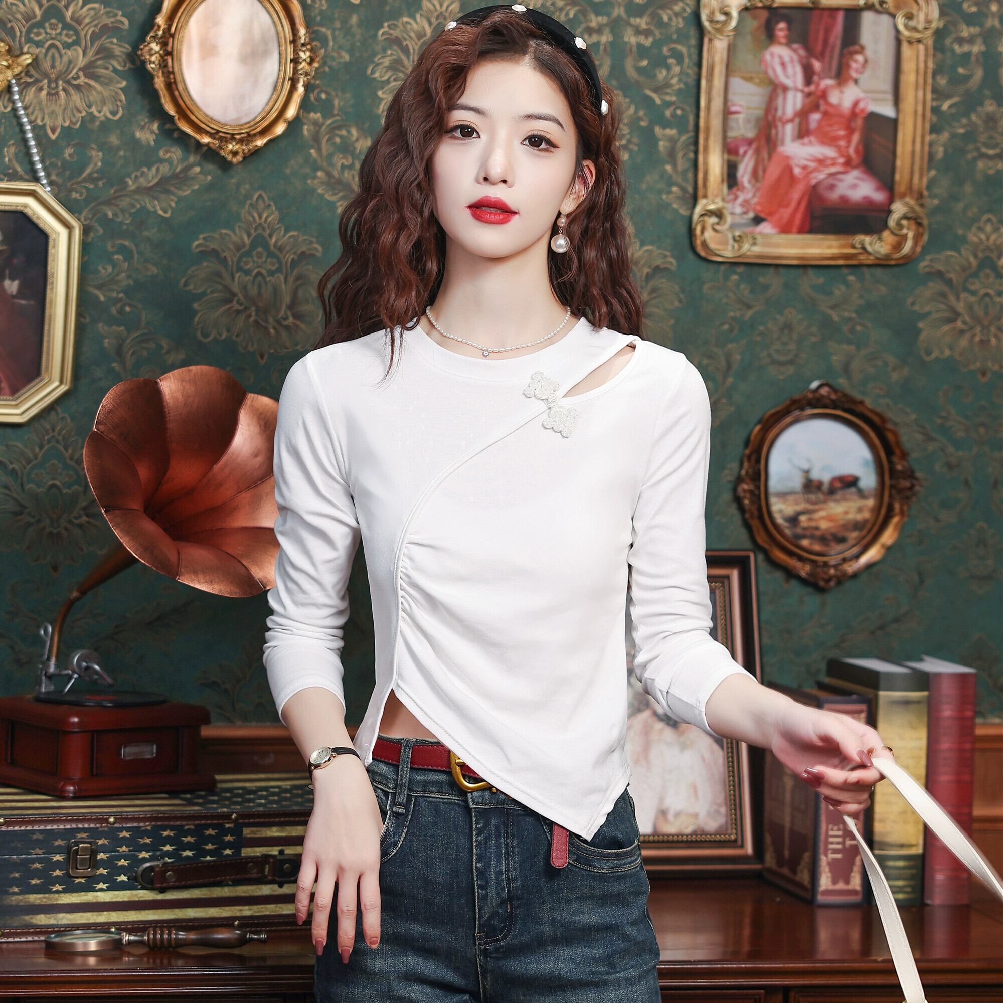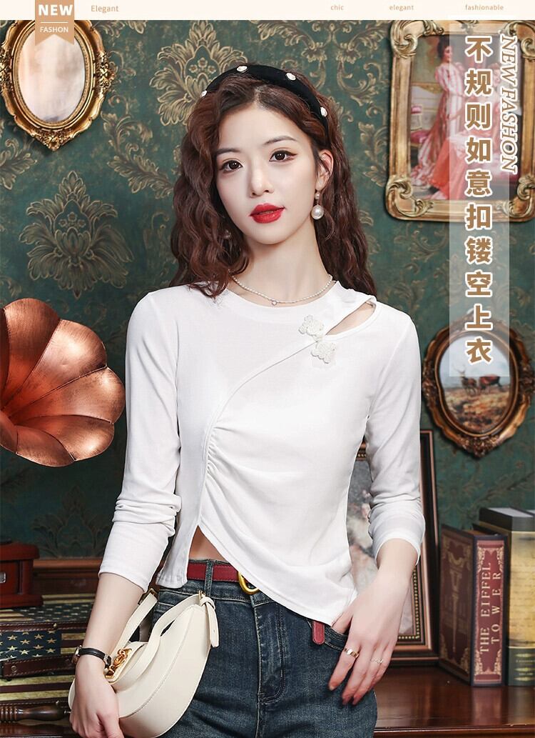 ボトリングシャツ女性 2024 新しいスタイルのユニークなデザインプリーツ控えめな不規則な長袖 Tシャツの女性のトップ ロング yingd7820242936
