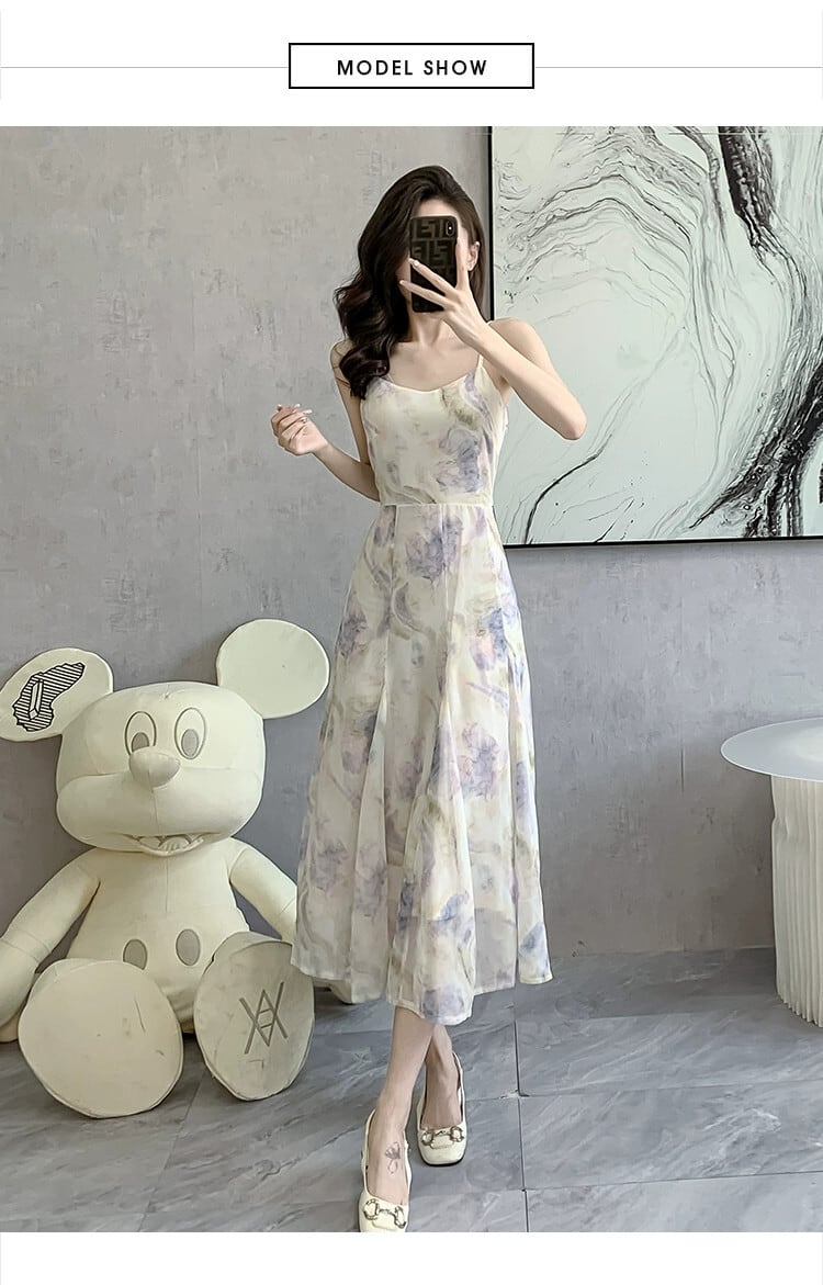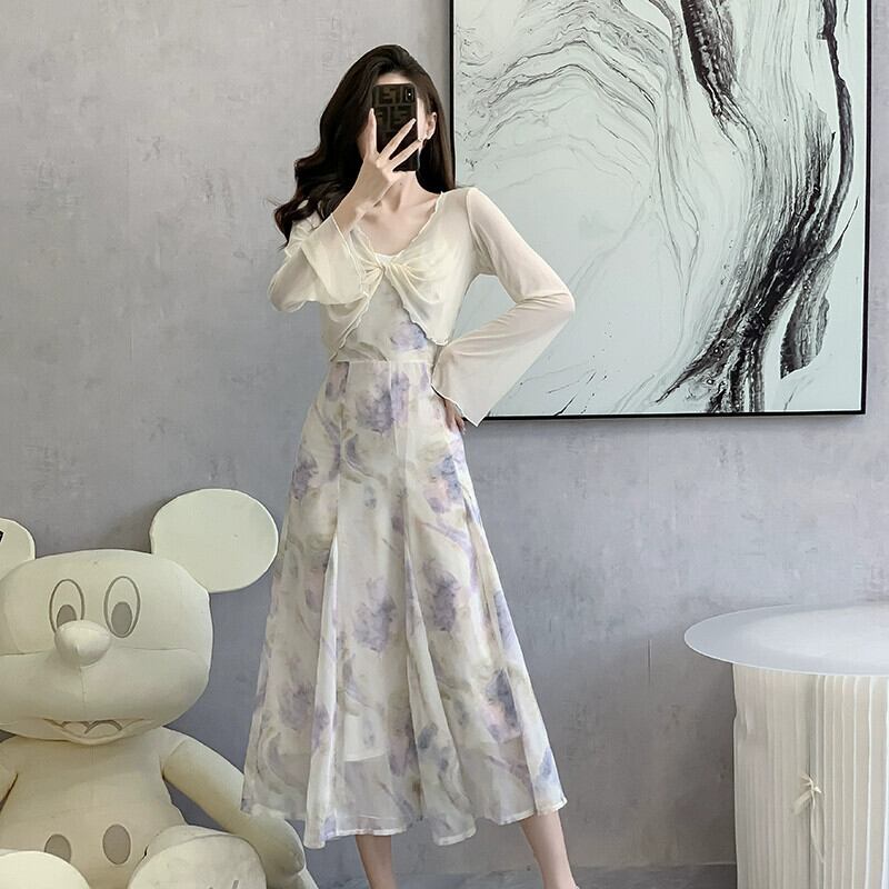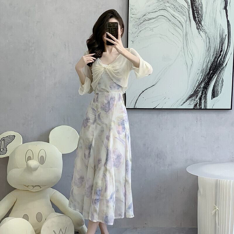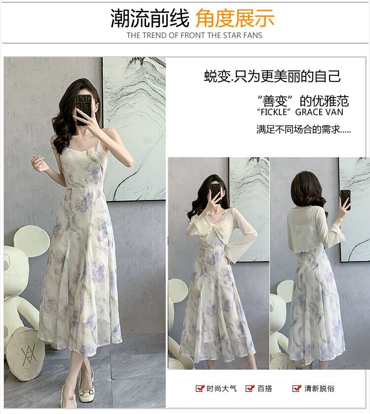 2024 早春の新作フレンチインクプリントシフォンサスペンダードレスレディースハイエンドアウターブラウス 2 点セット スプリング 春物 yingd76944352893