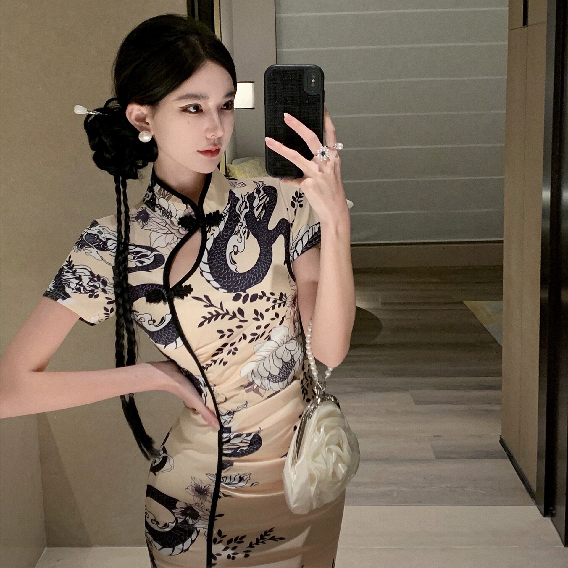中国のシックでユニークなスカート夏の女性 2024 スリムフィット半袖改良されたチャイナドレス女性 ショート ハーフスリーブ サマー 夏物 yingd93411873788