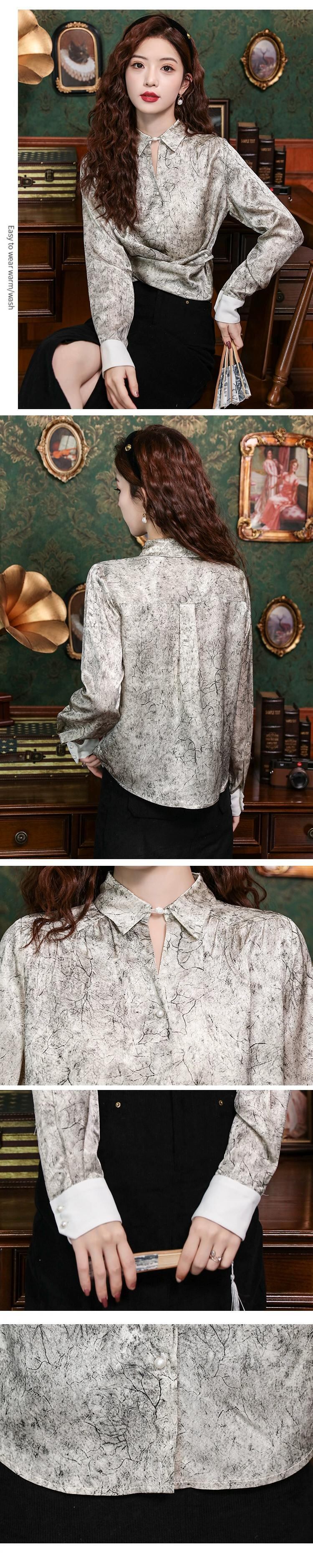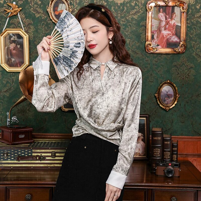 春の女性の 2024 新しいスタイルの女性のハイエンドアセテートサテン長袖シャツトップスレトロラペル女性のシャツ ロング スプリング 春物 yingd46406617033