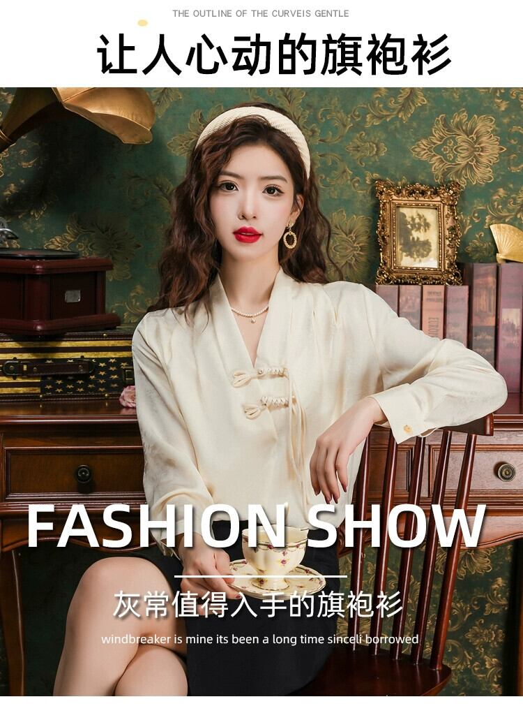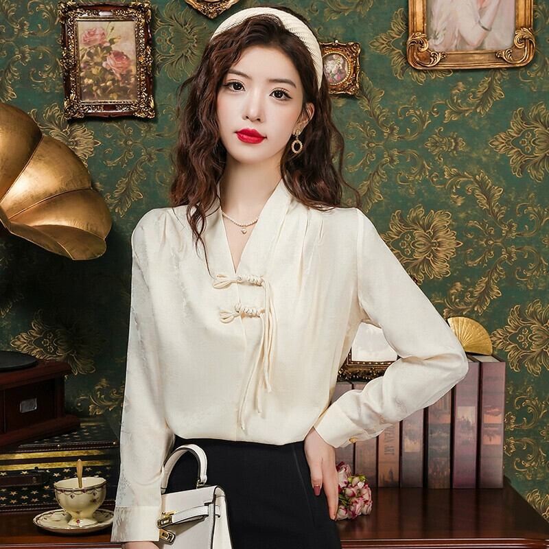 2024 早春の新スタイルのシャツのデザインニッチ V ネックチャイナノット長袖新しい中国風シャツの女性の国民風トップ ロング スプリング 春物 Vネック yingd34328941276
