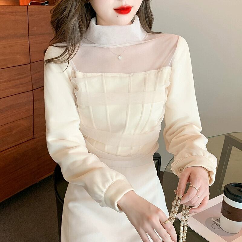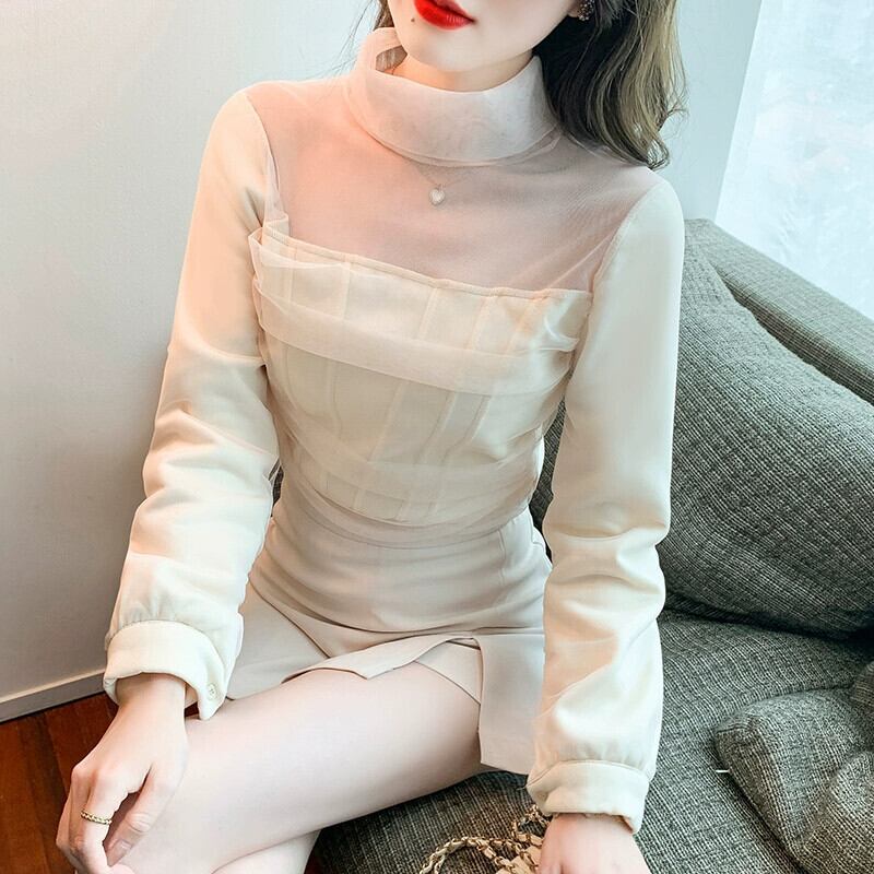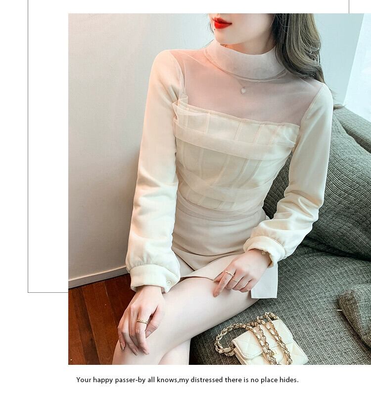 2024年春の新スタイルの女性の鎖骨露出メッシュトップス、気質の小さなシャツ、ファッショナブルな高級西洋スタイルのレースボトムシャツ スプリング 春物 yingd87854368525