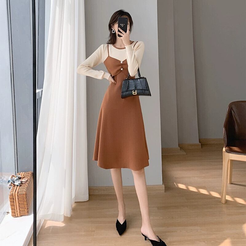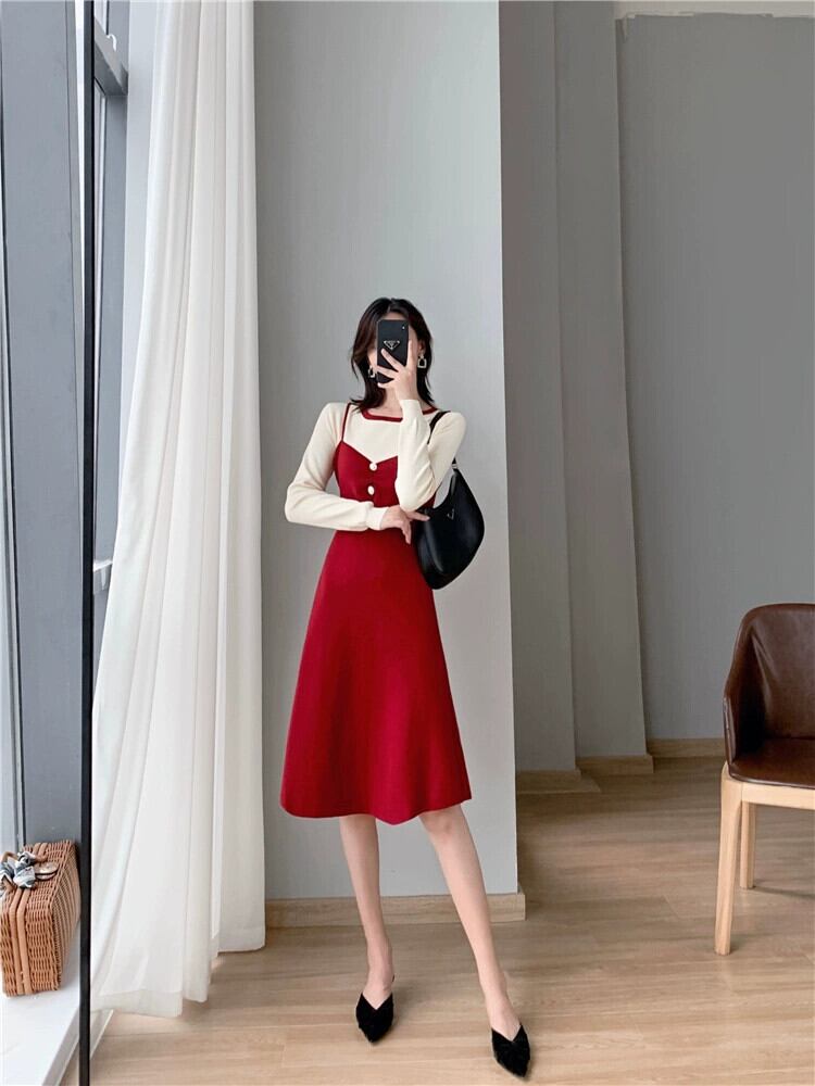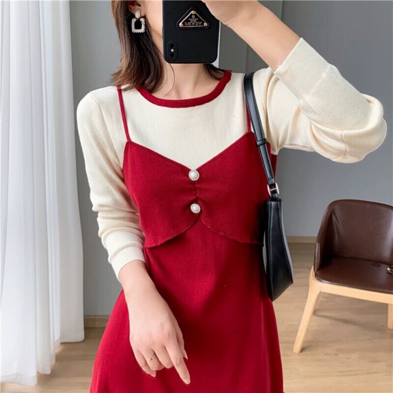 年服、クリスマス婦人服、姉妹気質、女神風フェイクツーピースニットレッドドレス yingd26361675422