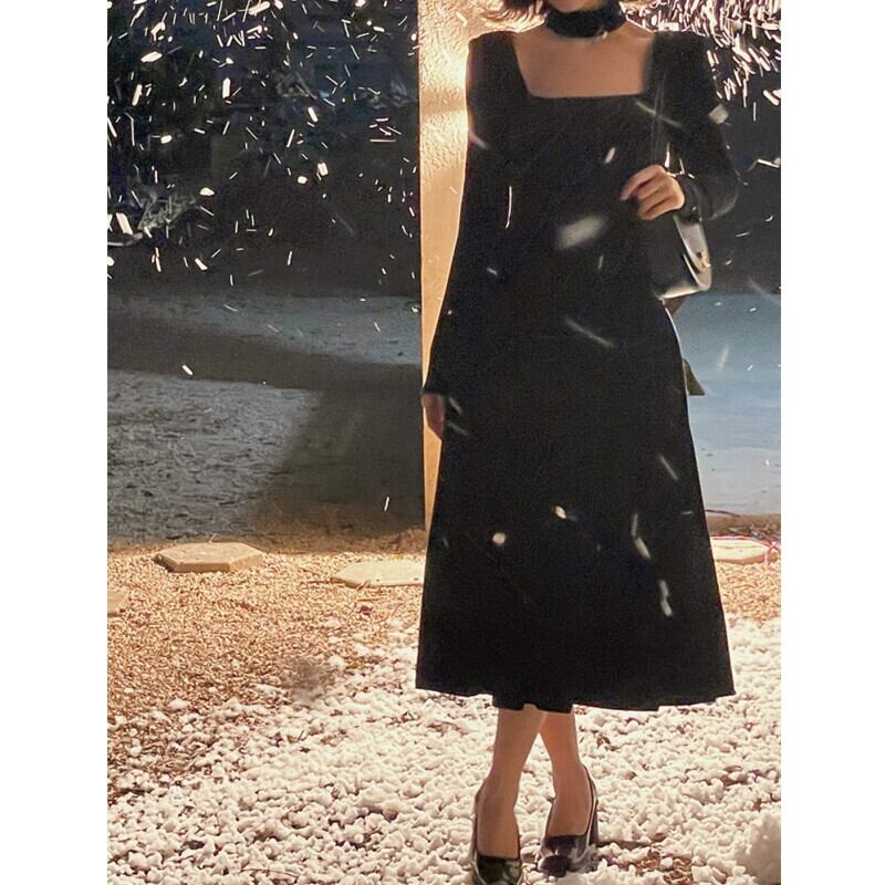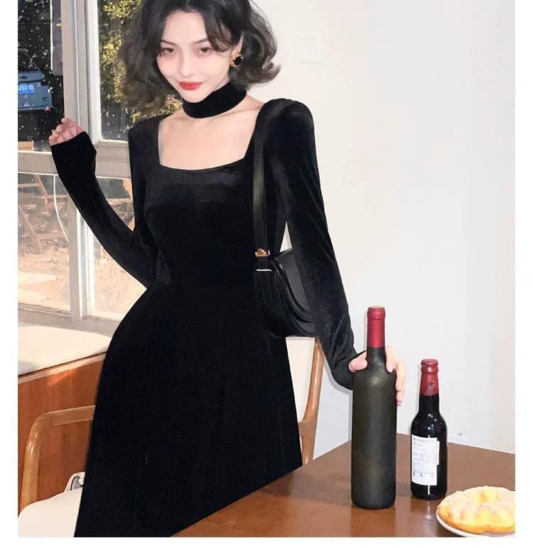 フランスのレトロなヘップバーン スタイルのリトル ブラック ドレス、見事なスカート、ハイエンドのウエストを締める長袖スクエアネック ベルベット ドレス、ロング スカート スクウェア yingd31793368801