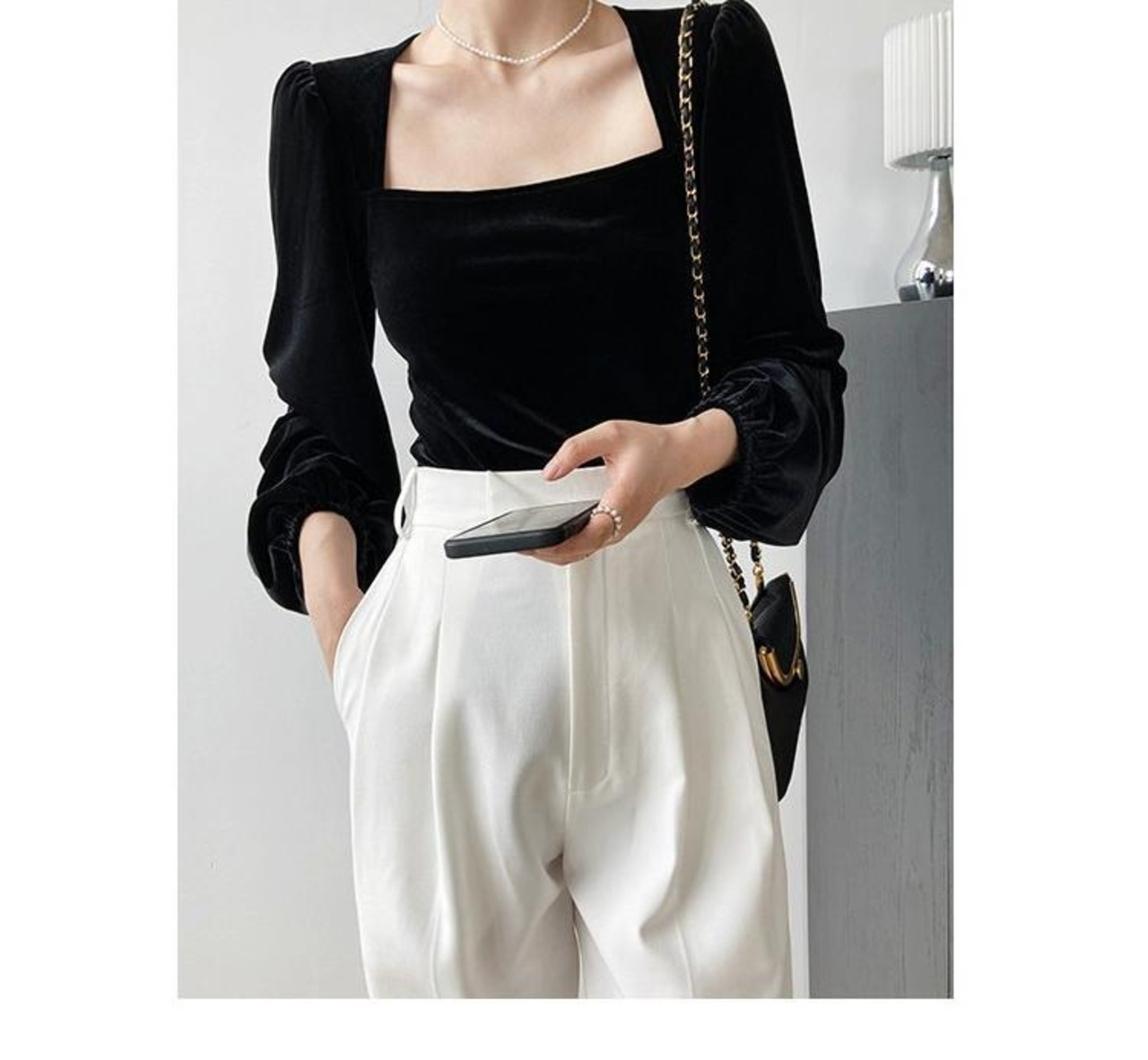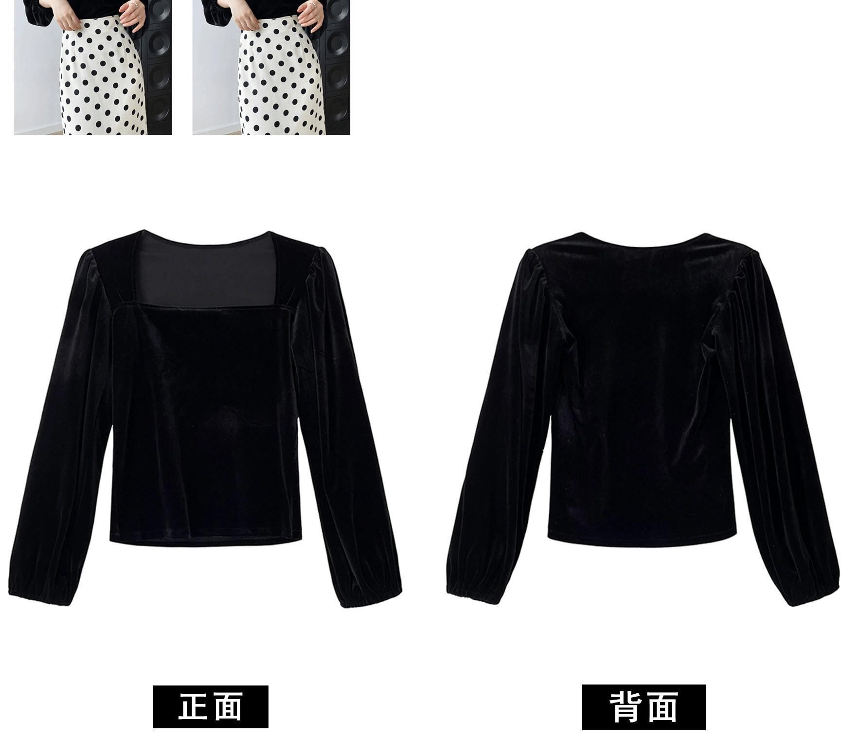ベルベット スクエア ネック トップ 秋 2024 レディース 長袖 鎖骨 パフ スリーブ フレンチ レトロ シャツ ロング オータム 秋物 スクウェア yingd90075162078